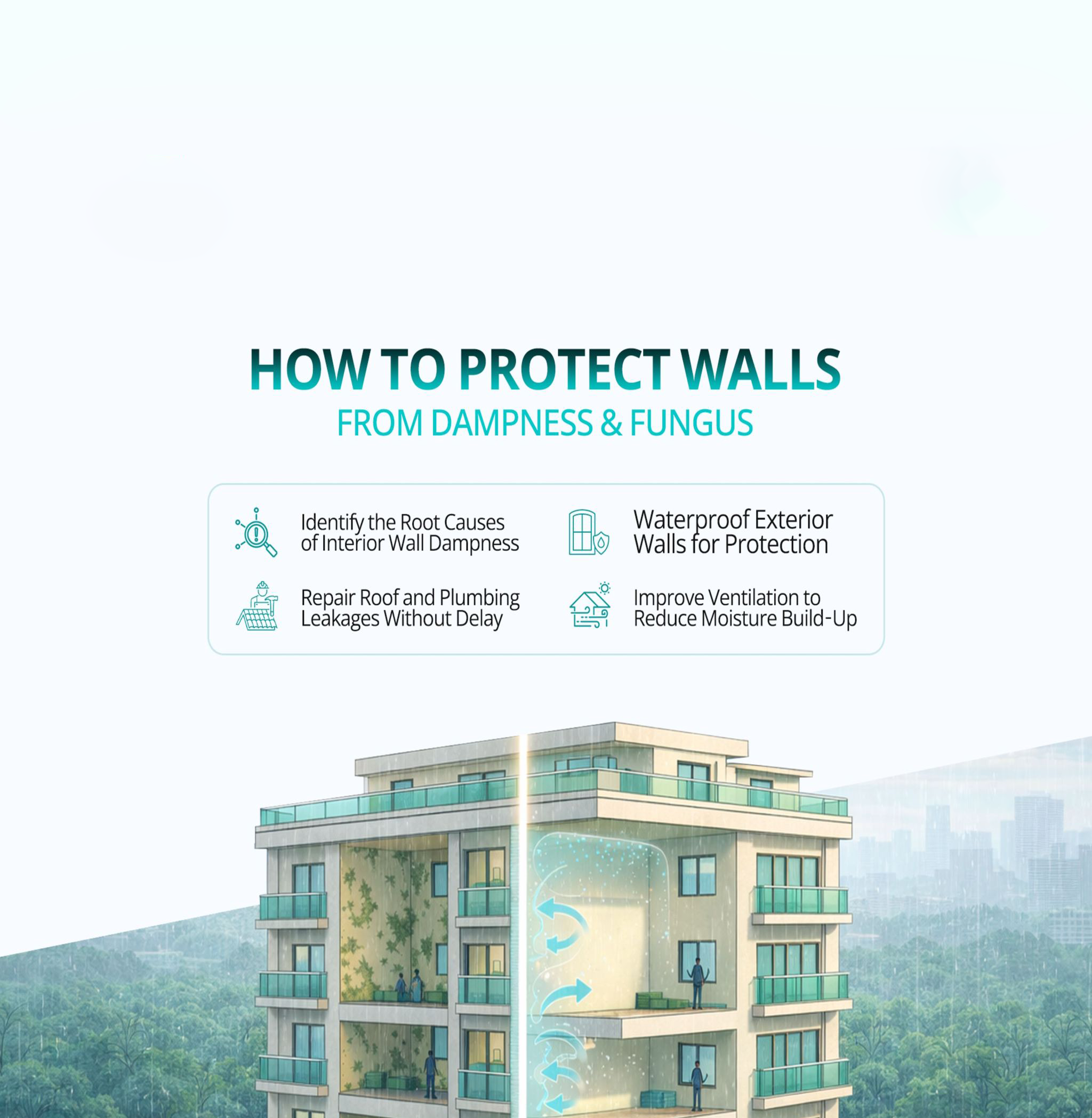 Protecting interior walls from dampness and fungus during the monsoon requires a well-planned approach that includes proper wall waterproofing, effective ventilation, indoor humidity control, high-quality materials, and timely preventive maintenance. Addressing moisture issues early helps preserve wall finishes, prevent health hazards, and improve indoor air quality.